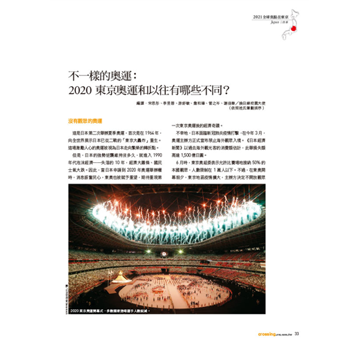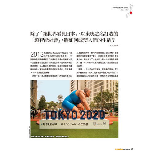 特別要和讀者朋友們強調的是:秋季刊《全球焦點在東京》並不只是「東奧報導」,也是藉由疫情下的東京奧運,檢視東京近年來在社會文化、科技環境等各方面的發展與未來趨勢。對日本來說,繼 1964 年後二次在東京舉辦夏季奧運,也是一次向世界展演日本近 10 年來,如何從 311 震災、少子及高齡化所衍伸的社會危機、低迷的經濟等挫折中重新站穩、華麗轉身,揭開令和年新頁的機會。固然過程中一波三折,加上疫情攪局、首相辭職⋯⋯,未來還有更多挑戰等在眼前,但這些年來,上自政府政府下至民間,仍然蓄積了一股改變的能量。