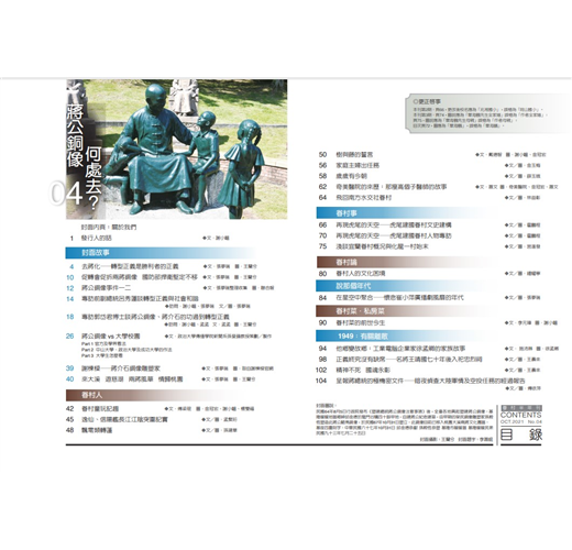 本期封面故事「蔣公銅像何處去」,討論蔣介石的功過與轉型正義。我們分別訪談了前副總統呂秀蓮女士及胡佛研究所兩蔣專家郭岱君博士,從不同角度探討此議題。此外,我們也委請政大傳播學院孫曼蘋教授策劃,由新聞系學生調查年輕世代的看法,來提供此議題的另一種角度。