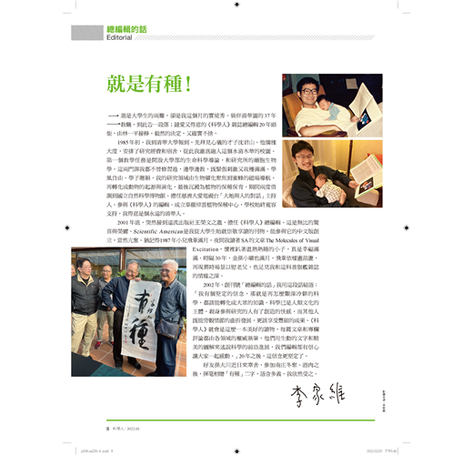 2002年,創刊號「總編輯的話」我用這段話結語:「我有個堅定的信念,那就是再怎麼艱深冷僻的科學,都該能轉化成大眾的知識。科學已是人類文化的主體,親身參與研究的人有了創造的快感,而其他人既能旁觀情節的曲折發展,更該享受豐碩的成果。《科學人》就會是這麼一本美好的讀物,每篇文章和專欄評論都由各領域的權威執筆,他們用生動的文字和精美的圖解來述說科學的前沿進展,我們編輯部有信心讓大家一起感動。」20年之後,這信念更堅定了。
