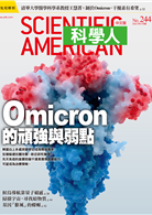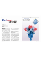 今年Omicron 變異株以超強傳播力掀起一波疫情高峰,它棘蛋白上的關鍵區域(封面上的紅色)有許多突變(紅色球體),使其能成功逃脫免疫系統偵測。科學家發現,廣泛用於治療慢性病毒感染的干擾素亦可抑制Omicron的感染,搭配其他抗病毒藥物,有潛力成為治療良方。