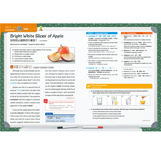 單字學習方面循序漸進,參考大考中心頒佈的「高中英文參考詞彙表」,每月依字級列出一般字彙、參考字彙、小辭典,生活、考試都實用。文法Language Notes採用圖解,清楚明白好吸收,每天還附有小測驗,可以馬上測試學到的成果喔!