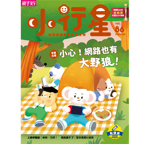 這期《小行星幼兒誌》的封面中,樂樂、心心、康康、奇奇來到戶外野餐,卻人手一臺3C設備,專注的上起網來;只見大野狼躲在樹後,偷偷觀察著他們上網的情況……伺機而動的大野狼,正象徵著網路使用也可能暗藏危險。
