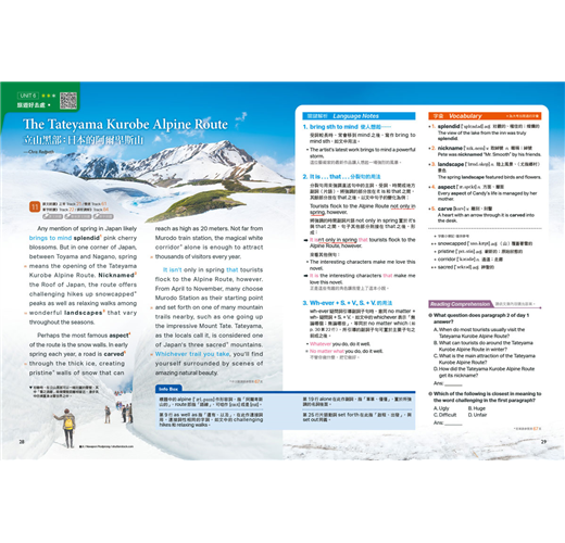 單字學習方面循序漸進,參考大考中心頒佈的「高中英文參考詞彙表」,每月依字級列出一般字彙、參考字彙、小辭典,生活、考試都實用。文法Language Notes採用圖解,清楚明白好吸收,每天還附有小測驗,可以馬上測試學到的成果喔!