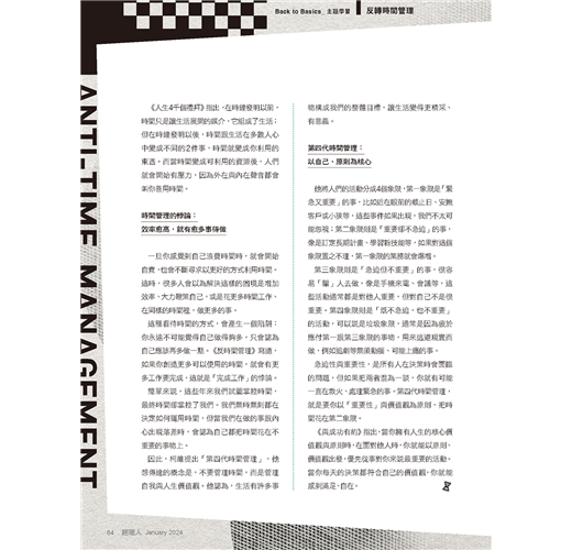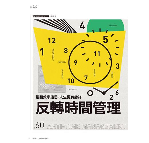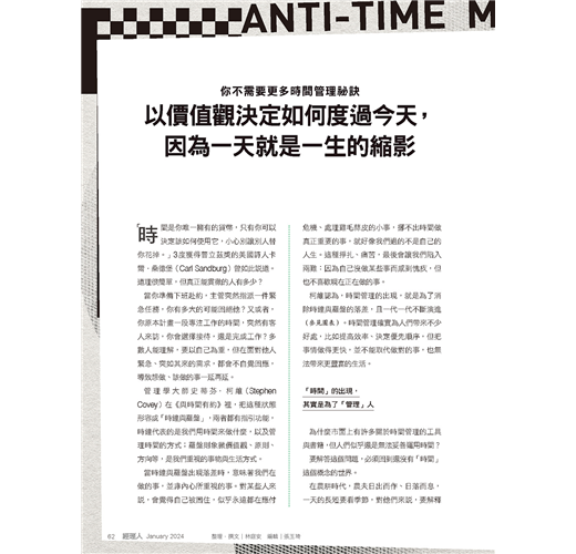 上帝是公平的,人無論天生貧富愚智強弱,一天都只有24小時。在談及時間管理的議題時,我們都曾經以不同的形式,接收過類似的概念。這句話乍聽之下有點勵志,仔細一想其實意義不大。從出生以來,時間就伴隨而來,它是免費的,我們不用努力就可以得到,唯一的差別只在於存活世間的長短。所以,重點應該擺在思考,「即使我擁有和全世界人一樣的每日時間長度,然後呢?」