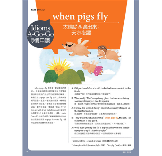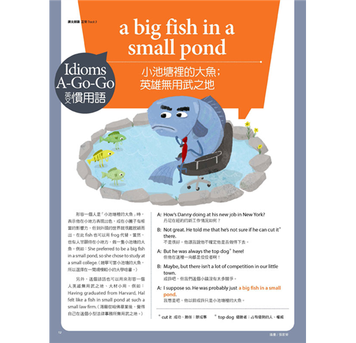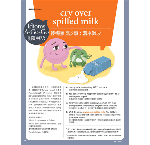 想說一口道地的英語,可以善加利用慣用語,讓你的口語表達更像母語人士。本書收錄了三十六個實用的慣用語,搭配生動活潑的插畫、典故和小對話來幫助你學習英語慣用語。想了解when pigs fly、on the same wavelength的意思,或者想知道英文慣用語中是否有類似「含著金湯匙出生」、「拐彎抹角」「拍馬屁」等的表達方式,就別錯過《即學即用 超實用英語會話X慣用語》收錄的內容。