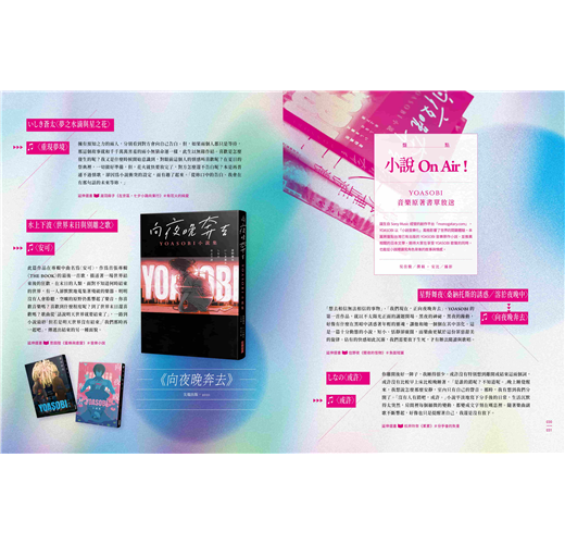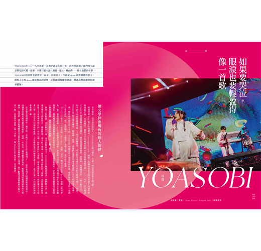 由作曲家Ayase與歌手ikura組成的雙人樂團YOASOBI,在二〇一九年憑著出道曲〈向夜晚奔去〉爆紅,以「小說音樂化」為特色,在出道四年間,已經成為代表性的J-POP樂團。本期專輯以「YOASOBI」為主題,以YOASOBI的重磅訪問為始,接續音樂相關的小說與動畫原著,全面盤點故事的起源,也邀請四位作家選曲並撰寫專文;另外,特別邀請到了日本樂評人ROCKIN’ ON JAPAN編集長山崎洋一郎,為讀者們揭示日本視角下的YOASOBI;此外,我們也邀請「宇宙電波UNIPA」的Jesse與「裝咖人」的張嘉祥,從「小說音樂化」的角度來詮釋YOASOBI的跨界魅力。