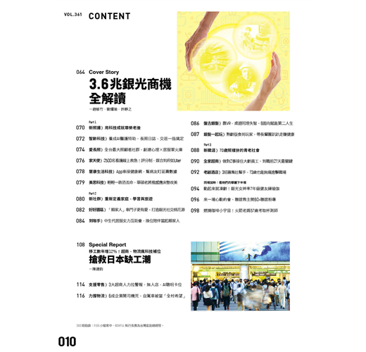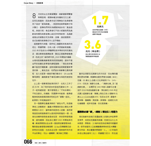 特約主筆趙郁竹從以上3個方向出發,從台北、台中到台南一路採訪案例並參加研討會,完成這期探索「銀光商機」的封面故事。人口老化原本是社會問題,並不好解,但是換個方式轉為市場問題,有需求有供給,結合新創、大企業和商業模式,答案就變得清晰。
