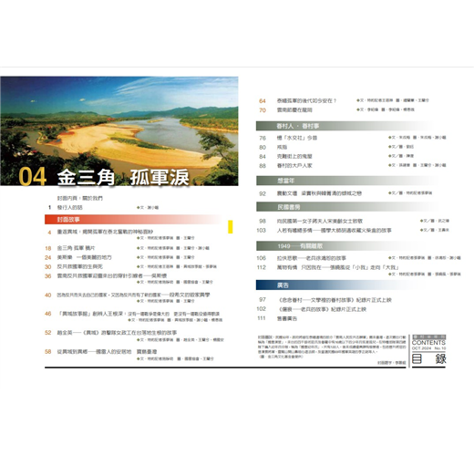 除「雲南反共救國軍」專題外,本期新闢專欄「民國書房」,娓娓道來民國人物的斯人斯事,首先2篇是書寫民國第一女子宋美齡,以及胡適的收藏癖。「想當年」專欄回溯梁實秋先生的「傾城之戀」。「1949有關離散」,則報導第一代老兵徐鴻恕的一生,以及散文大師張曉風的感人故事。