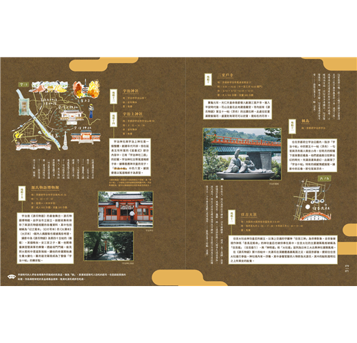 石山寺 廬山寺 平安宮朝堂院太極殿跡 上賀茂神社 住吉大社 渡月橋 平等院 橋姬社 宇治神社 三室戶寺 橘島 源氏物語博物館⋯⋯等15處小說舞台