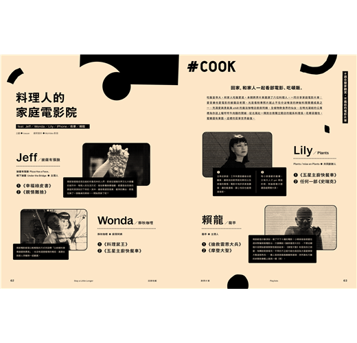 本期訪談單元,我們邀請樂團主唱、資深演員、跨足電影與藝術圈的導演們,談他們對「家」的想像,成長經驗與家人的關係,以及海海人生經驗帶來的一波波心境轉變。我們訪問多位新世代料理人,談他們的電影回憶,分享他們想為家人端上桌的料理。我們也拜訪來台定居的香港文人,聊他們與在地「食」的交會,及構築一個新家的心情。