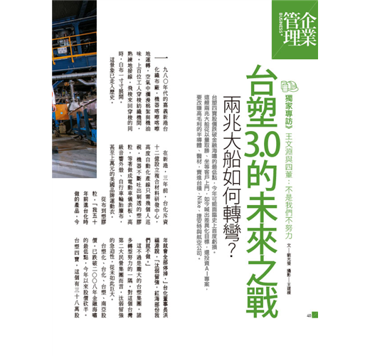 昔日存股族最愛的台塑四寶,今年股價腰斬,集團總裁王文淵與台塑、南亞、台化、台塑化四位董事長首度打破沉默,披露台塑3.0的轉型藍圖。(見40頁)