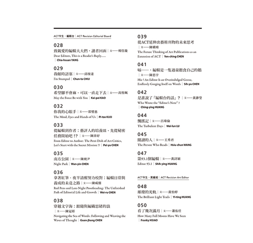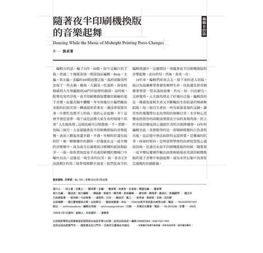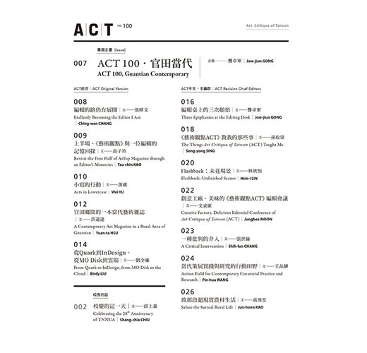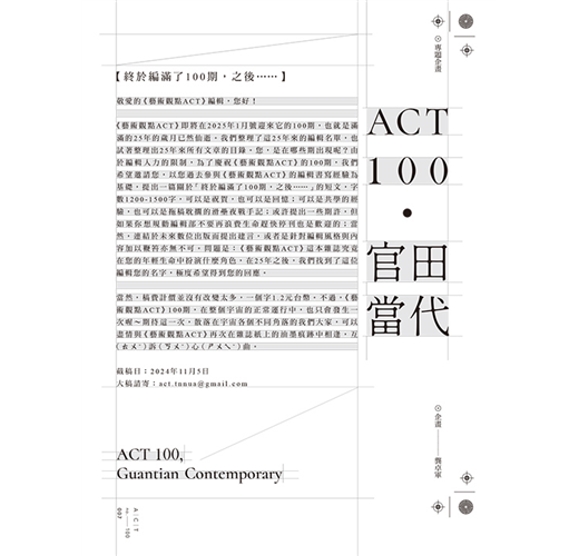 從1999年1月1日發行創刊號開始,《藝術觀點ACT》即將在2025年1月號迎來它的100期,也就是滿滿的25年歲月已然流逝,我們整理了這25年來超過百位的編輯名單,也試著綜合雜誌網站既有資料,整理出25年來所有文章的目錄,如果一期用平均七萬字來計算的話,100期意味著700萬字的論述,與相搭配的上萬張圖像,滲透著前仆後繼的編輯血汗,以及25年來兩千萬元以上納稅人的公帑,都投入在這培養臺灣當代藝術書寫編輯人才的平台上,本期除邀請編輯們抒發對《藝術觀點ACT》的印象與期許之外,次專題亦將呈現「我們從河而來」國際論壇的精彩內容。