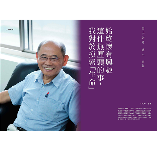 本期詩人專訪,目光投向裕隆汽車副董事長、詩人古魯(本名姚振祥),其生命歷程、創作動機也是對生命、對世界、對「秩序」的探問。他以工程師的理性與邏輯,組裝詩的零件,並以求真精神探尋萬物的規律與秩序,致力於在對立的事物中,尋找共通的法則。在農村成長的他,詩作中常帶有自然元素,貼近自然脈動的視角,也喚起在現代都市社會裡遺落的純粹與質樸。而面臨生命情境的轉折,詩人是如何回應內在的失落?在當代社會催促人們快速放下傷痛,將目光看往新的目標時,詩人古魯則以寫作讓哀傷留有容身之地,在詩中自我轉化、與逝者對話、賦予逝去當下全新的意義。