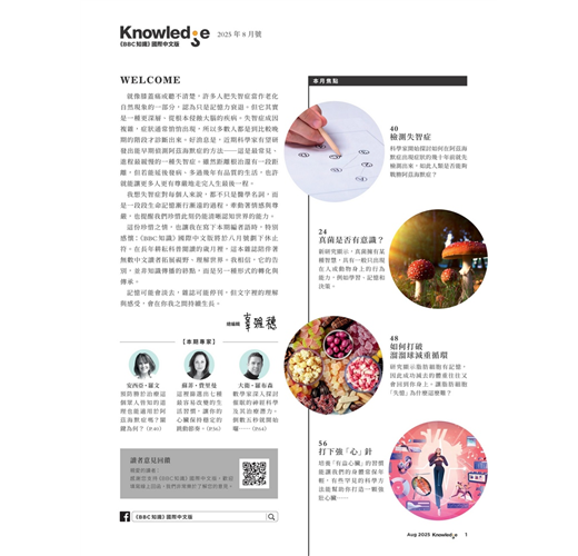 這份珍惜之情,也讓我在寫下本期編者語時,特別感懷:《BBC知識》國際中文版將於八月號劃下休止符。在長年耕耘科普閱讀的歲月裡,這本雜誌陪伴著無數中文讀者拓展視野、理解世界。我相信,它的告別,並非知識傳播的終點,而是另一種形式的轉化與傳承。