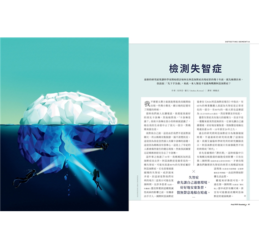 就像膝蓋痛或聽不清楚,許多人把失智症當作老化自然現象的一部分,認為只是記憶力衰退。但它其實是一種更深層、從根本侵蝕大腦的疾病。失智症成因複雜,症狀通常悄悄出現,所以多數人都是到比較晚期的階段才診斷出來。好消息是,近期科學家有望研發出能早期偵測阿茲海默症的方法――這是最常見、進程最緩慢的一種失智症。雖然距離根治還有一段距離,但若能延後發病、多過幾年有品質的生活,也許就能讓更多人更有尊嚴地走完人生最後一程。