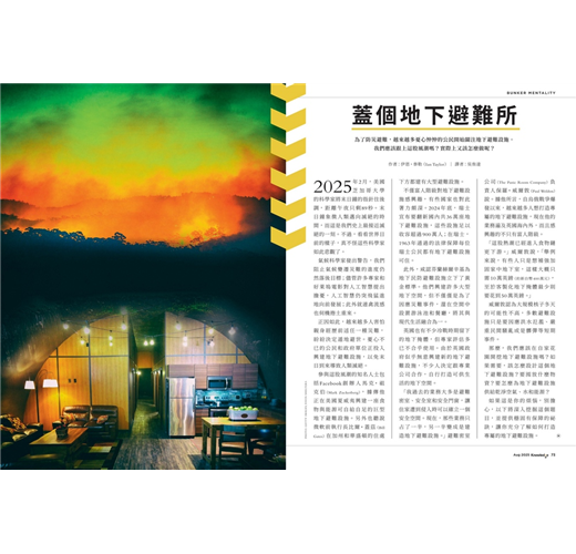 面對氣候變遷、戰爭與疫病等不確定的未來,越來越多憂心忡忡的公民開始關注地下避難設施。我們應該跟上這股風潮嗎?實際上又該怎麼做呢?