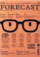 Monocle 有新的姊妹刊物了!這本《Forecast》將在12月中旬隆重上市,著重在預測明年的未來趨勢。Monocle集結了許多頂尖的經濟學者、歷史觀察者、記者、商業智庫、外交官、城市規劃專家、策略管理大師和最新科技應用學者,共同為2015年做出了這份趨勢報告,預估了未來一年全世界在政治、經濟、產業、文化事業、城市發展、學術發展、突破性醫療技術以及設計風格的變化。這本劃時代的趨勢報告將以年刊的形式發行全世界,厚達240頁的內容包括豐富的圖表與立論精闢的文章,伴你度過一個美好的跨年假期。