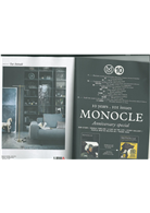 雖說今天Monocle慶祝它的發行10週年生日。如果從孕育期開始算起,它已經有25年的歲月。20世紀80年代末,Monocle的創辦人Tyler Brule覺得國新聞周刊Der Spiegel 和 Stern 比起英美的新聞周刊更嚴謹也更國際化。Tyler Brule興起有一天要發行屬於自己的新聞刊物的念頭,並開始收集自己喜歡的雜誌封面。六年後,因為忙著出版Wallpaper雜誌,並沒有把這個想法具體實現。又過了五年,他又開始針對市場上付之闕如的時事類型雜誌產生興趣,重拾編輯整理企劃,其中包括搜集靈感和擬訂計劃書。在一群同事和顧問幫助之下,一年半的時間內,總共募集到超過300萬歐元的開辦費,決定在2007年2月推出了Monocle雜誌。至今,Monocle已經成為一個成功的品牌,從一本月刊成為一個世界矚目的媒體。旗下包括書籍、影音、廣播、新聞快訊、咖啡館和主題商店。十年來,經常被問及媒體事業要如何安然度過詭譎多變的時代?Tyler Brule回答這個問題是跟他當初推出Monocle的時候並無二致,那就是:聰明地選擇你的合夥人並且跟你想法一致的編輯共事,凡事不必帶頭打先鋒。