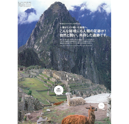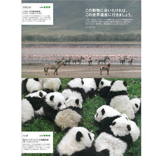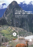 卷頭特集帶來今年六月正式通過申請,位於群馬縣的「富岡製絲廠及絹產業遺產群」;開業至今不間斷革新進步的技術和來自各界的高評價,此項乃日本近代文化遺產首度登記之世界遺產。緊接著單元要揭曉超乎想像的謎樣空中都市、巨大樹木、一望無際的冰河,還有富含宗教、神話、民族能量的神聖場所以及遇見保育類可愛野生動物之地,透過誌中分門別類的介紹說明,徹底掌握世界遺產的驚嘆魅力。