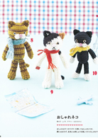 「咪著眼睛午睡中的貓咪」、「繫上鮮豔圍巾的時尚貓咪」、「頭戴動物造型頭套的貓咪」、「體型圓潤的慵懶貓咪」、「抱著玩具玩耍中的貓咪」、「讓人捨不得吃下肚的握壽司貓咪」、「可招來財運的招財貓」;以各種毛線素材編織完成的虎貓、黑貓、三毛貓,透過詳細教學圖解,不用三兩下就能輕鬆完成。