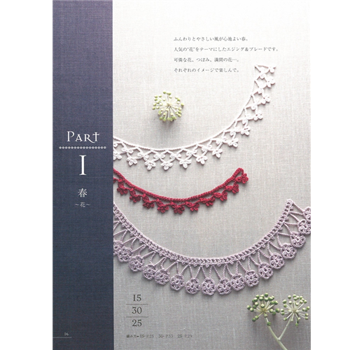 本誌中將以四季為主題,介紹春日的蝴蝶花朵、夏季的海濤貝殼、秋日的果實落葉、冬季的雪花結晶等總數多達130款將絲線透過鉤針去環繞結繩,勾勒各種形狀的迴圈,最終編織成一幅幅宛如結晶又好似植物葉脈、細膩精緻的美麗蕾絲。誌中的作品都採取實用的織帶狀設計,方便作品完成之後能夠後續運用在各種日常需求之中,並且以實際照片和插圖來詳細示範製作流程,對於基本編織技巧也有提供講解,讓即使是編織初學者的讀者也能迅速掌握技巧,讓您可以輕鬆地開始投入手工蕾絲的編織製作。