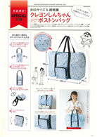 蠟筆小新旅行輕量提袋「蠟筆小新可愛情報特刊」中要為大家介紹經典動漫「蠟筆小新」的最新週邊商品,還要附贈一款波士頓包造型的旅行用提袋。這款提袋有三大優點,可以固定在行李箱的拉桿上,可以摺疊收納攜帶方便,最重要的是上面印滿了蠟筆小新、妹妹小葵和小狗小白的設計圖案,清爽又可愛的設計相當實用。雖然喜歡蠟筆小新,但又覺得這部作品太過鮮明的童趣畫風不適合大人使用嗎?這款旅行提袋就會是你的最佳選擇哦。尺寸:高33、寬46、底寬17公分。材質:聚酯纖維。