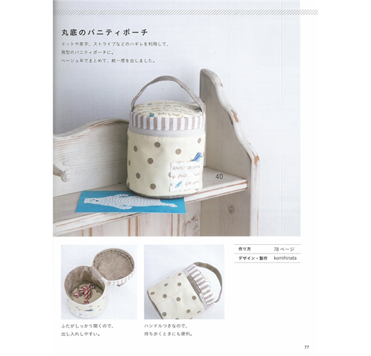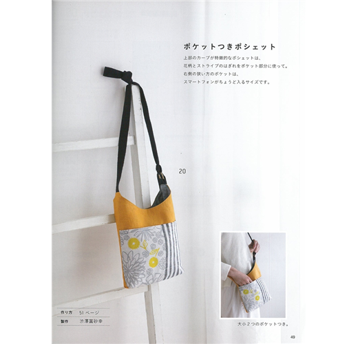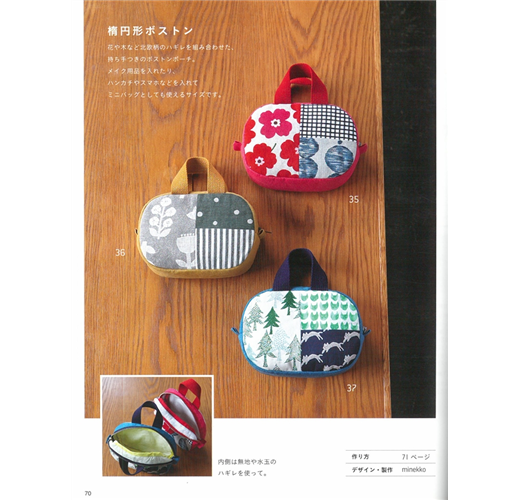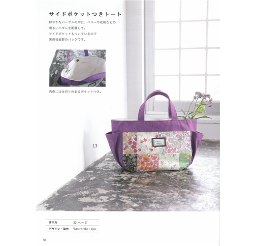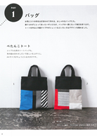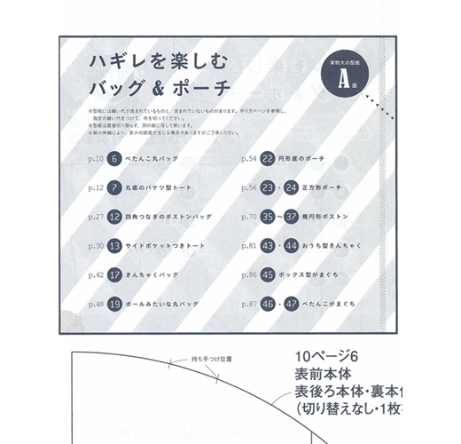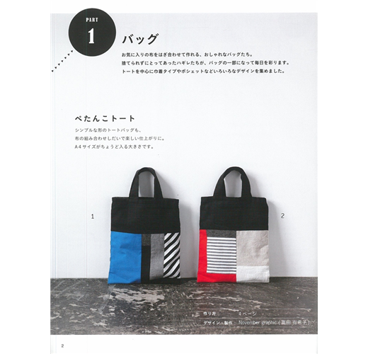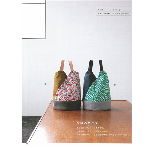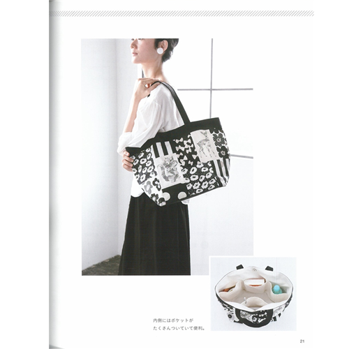 可放A4大小的基本款「扁平托特包」、異素材皮革提把的「圓底桶型托特包」、內裡多口袋設計的「黑白配色提包」、開闔處呈現漂亮弧度的「小巧斜背包」、手提造型超可愛的「橢圓形波士頓收納包」、素色搭配印花圖案的「花苞造型提袋」;夾頁附贈原寸大紙型,搭配內頁詳細教學圖解,喜歡哪個包包自己動手做。