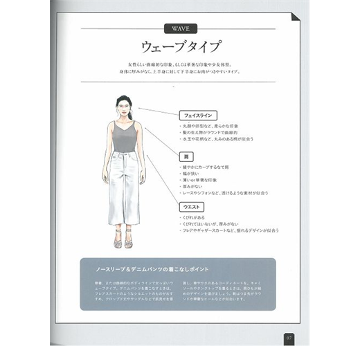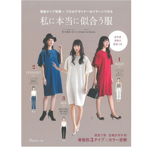 本冊將人體的骨架分為3大類型,卷頭首先列出選項來提供判斷自己的骨架類型,並以插圖來分別解析「WAVE、STRAIGHT、MIX」等3種類型骨架的體型特色、以及服飾穿搭的要領。接下來,再依據上述3種骨架類型,來分別提案各自適合的服飾設計,網羅包含洋裝、上衣、裙子、外套等15款的作品,並進一步介紹了3種骨架類型適合與不適合的單品和材質、色彩選擇、圖解穿搭講座、骨架別作品寫真目錄等,以及基礎裁縫的寫真步驟教學,並附上作法解說和實物大型紙。