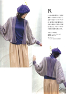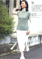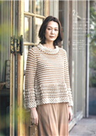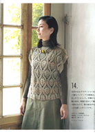 本期共收錄了30樣鉤針織品示範,其中有多款同款不同色的選擇,具修飾身形效果、前襟設計滿富巧思的背心、罩衫、開襟衫,花樣華麗的多功能披肩,藝術感的小外套,還有保暖的短圍巾、貝蕾帽等。每一種示範織品皆詳列示範線材材質、色號及用量資訊、使用針號、完成尺寸、織片密度、編織要點、模樣編排花等。