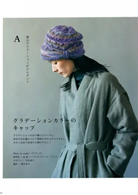 紫色系的漸層線編織出筒狀帽身,帽緣抓皺出結飾,相較於漸層線,素色線更顯花紋。