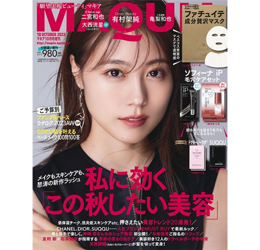 另外,本期還要請到知名彩妝師林由香里來教大家如何用秋季新色彩妝品畫出流行妝容,並且要為大家介紹今年秋天最受矚目的保養品,而在今年迎接30歲的日本女星有村架純,本期特別要請到有村架純來和大家分享他美麗的秘密,除此之外,本期還要收錄二宮和也、大西流星(浪花男子)…等人的最新專訪。(本誌與「MAQUIA 10月號/2023─附SOFINA iP毛孔護膚清潔組)」的封面寫真不同,與「MAQUIA(2023.10)特別版:大西流星(浪花男子)(附SOFINA iP毛孔護膚清潔組)」的封面人物不同,而且僅本誌有附上FATUITE面膜)