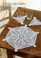 單片可當作杯墊的三角形蕾絲織片,集合六片單元接拼起來就能變成大片的六角形蕾絲桌墊。