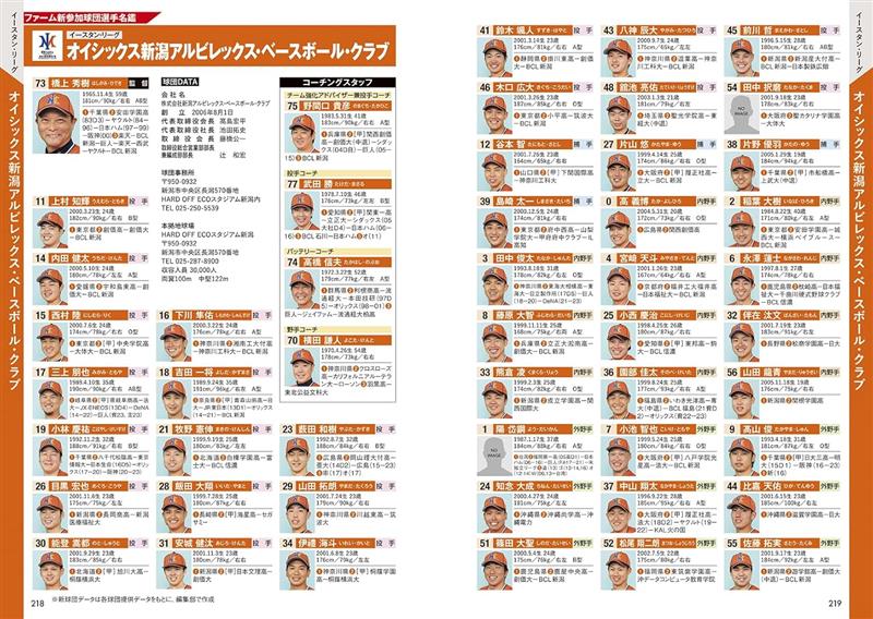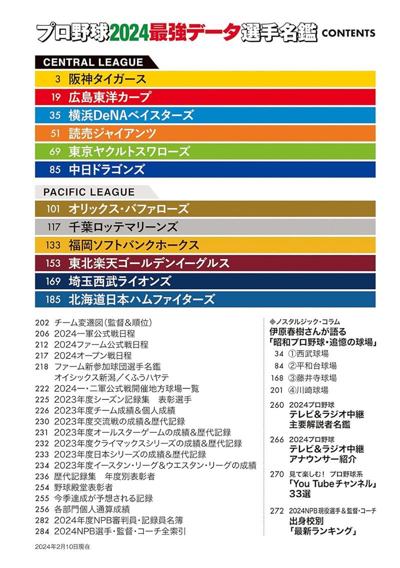 通な野球ファン納得の”高品質データ”満載の「最強データ選手名鑑」2024年度版が発売!●支配下、育成全選手、監督・コーチの詳細データ●歴代の通算記録や表彰選手情報を豊富に収録●今年よりファームに新規参入する2球団、くふうハヤテベンチャーズ静岡、新潟アルビレックス・ベースボール・クラブの全選手・監督・コーチのデータを収録●現役選手・監督・コーチの出身高校・大学を独自集計。一目でわかるようにランキング化●主要解説者、テレビ・ラジオ各局、配信実況アナウンサー一覧 etc.
