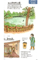 在Part 1「雀躍不已的街道漫遊」,透過插畫和解說來收錄了「神田、青山、上野、築地、藏前、谷中、二子玉川、中目黑、合羽橋、清澄白河、人形町、日比谷、赤坂、淺草、麻布十番、四谷、代代木公園、駒場、西荻窪、吉祥寺」20個地區的觀光地圖&總計160景點的導覽。Part 2「特別日子的啜飲漫遊」,則是整理了自家焙煎咖啡館、可以預約參觀的東京都市型葡萄酒坊、精釀啤酒專賣店,同樣以插畫的方式來作介紹。此外,作者還分享了自己愛用的文具用品,並以四個主題專欄來匯整介紹「推薦的胡蘿蔔蛋糕、鯛魚燒&銅鑼燒名店巡禮、人氣不墜的和風洋食、備受喜愛的稻荷壽司」。