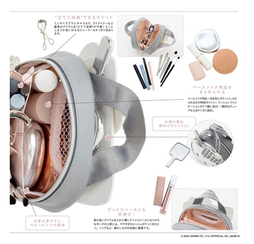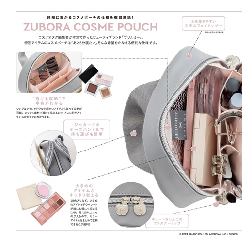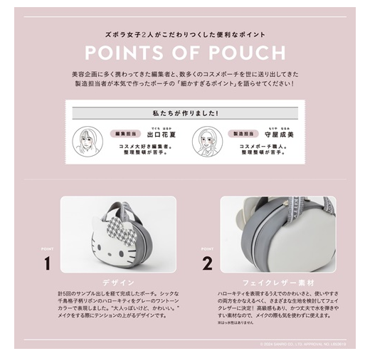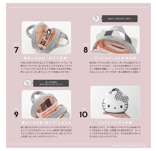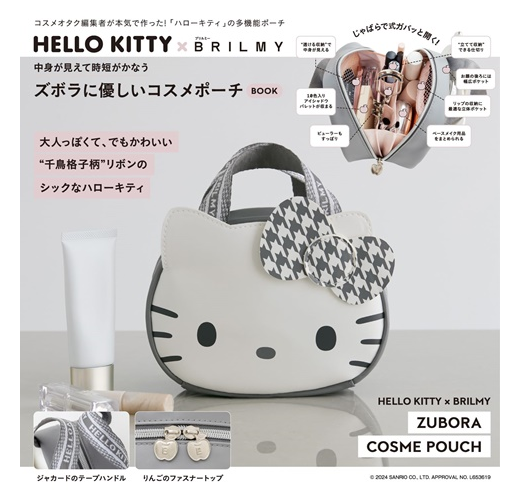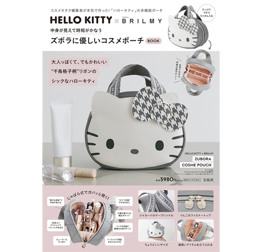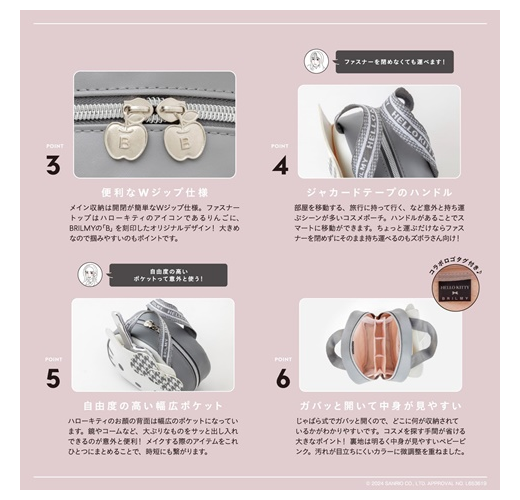 由美妝宅編主導,推出以來大受好評的人氣美妝品牌「BRILMY」,最新單品特刊首度和HELLO KITTY聯名,送上大人專屬灰白配色、帥氣可愛的造型化妝包。包包整體採用不易滲水的高質感合成皮革材質,設計焦點包括醒目的千鳥格紋蝴蝶結,貼心雙頭拉鍊開闔,收放拿取物品更方便,仔細看拉片還是蘋果造型。內含1網布拉鏈袋及多個置物隔層,可按彩妝&底妝分類收納,手提織帶正面為HELLO KITTY印字,不只好拿更耐髒,徹底滿足大人對化妝包的需求。