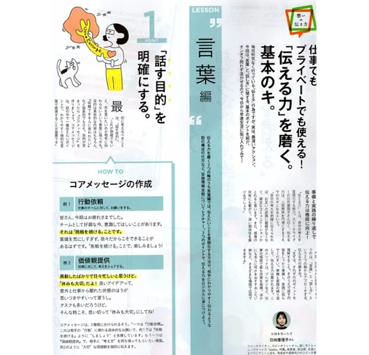 除了要先明確知道談話的主題之外,還要注意音量以及動作,想要好好地傳遞自己的心意就要先學會溝通技巧,在這便要請到演說訓練師日向優理子來教大家如何磨練溝通技巧。