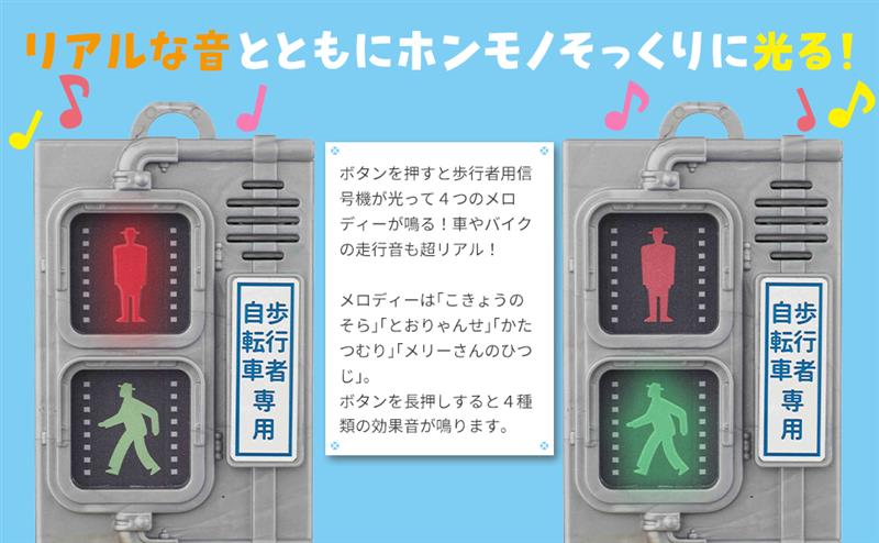 「交通工具車輛趣味遊戲繪本:附有聲交通號誌」,為附有真實信號燈玩具的雜誌,內容可以讓大朋友小朋友學習交通號誌規則,當中收錄有「故鄉的天空」、「とおりゃんせ」等四種信號燈播放的傳統兒歌歌曲,以及「布穀鳥」、「ピヨピヨ」等長按時播放的隱藏曲目,玩具的設計充滿了趣味!也將詳細介紹交通信號燈的原理和規則、交通地圖以及世界各地交通號誌的信號,讓平時在街上玩耍的孩子們能夠清楚了解與熟知交通規則,透過地圖移動車輛,觀察標誌,並在號誌燈的附錄中等待紅燈變成綠燈,從小就習得遵守規則並安全快樂的玩耍喔!