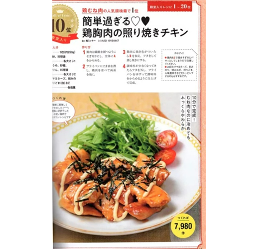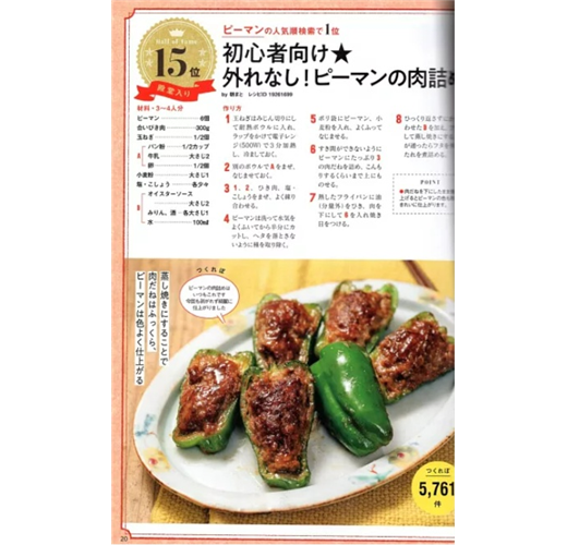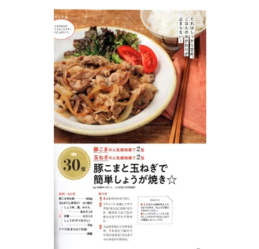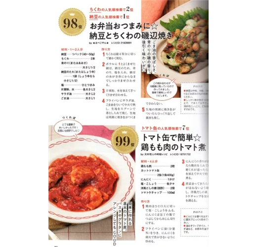 位居第一名的是黃金比例、絕對好吃的馬鈴薯燉肉,接下來有各式肉類、配菜、沙拉、漬物、點心…等豐富選擇,其中有不少可以預先做好的常備菜,以簡單美味為大前提的實用內容,將有效減輕下廚的負擔,歡迎一起來參考這本「cookpad人氣料理排行食譜特選專集」。