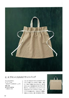 這是使用一塊亞麻布,然後簡單加上提把、束口帶、並以緞帶取代穿繩,就可以製作出來的大尺寸扁平束口袋。若是將提把往裡摺,再將穿繩繫在腰部,就可以快速變身成簡易的圍裙。