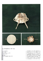 全部展開來是一個圓形的平面,抽繩束緊便可成為立體花朵狀的這款首飾袋,外側是使用四片條紋布來拼接,內側則是選用圓點布以重疊放射狀來縫合,另外再製作8個口袋。若是將尺寸放大,也可以當作裁縫工具包來使用。
