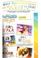 本誌收錄了來自特別企劃所公開的100件插畫,依據各插畫中偶像身上穿著的衣裝,以活動舉辦的時間先後來重新編排順序。在翻閱欣賞本誌的時候,可以細細回味10年來的軌跡。卷末還將「100 steps on the “Road to 10th”」登場衣裝的活動做成年表,搭配印象深刻的卡片插畫來一起回顧。此外還將插畫依據SNS投稿順序做成100 days Calendar,並收錄了10周年特企劃製作團隊的專訪。
