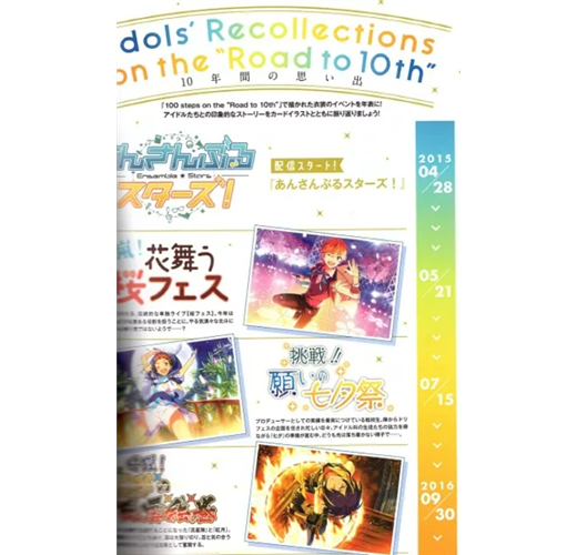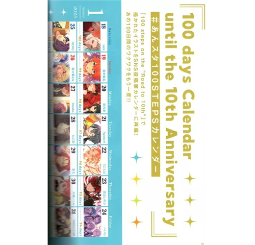 在社媒上話題沸騰,總按讚數超過400萬的「100 steps on the “Road to 10th”」,是於2025年1月18日~同年4月27日所舉辦,為了慶祝《偶像夢幻祭》10周年之倒數100日的特別企劃。全部15支團體、多達54位的偶像,以及與他們一起在作品中登場來豐富故事的角色們,由陣容華麗的100位插畫家,以各自不同的插畫風格,描繪出偶像們的神采飛揚。
