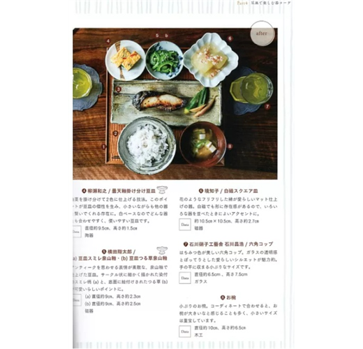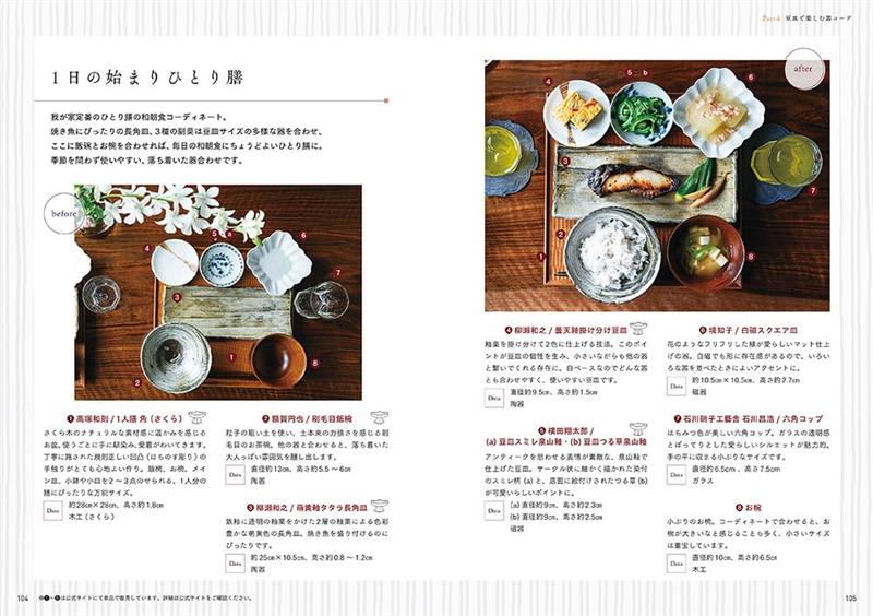 作者家的定番和食早餐,通常為1道煎魚主菜、3道配菜、飯和湯等的組合。使用的器皿可以不分季節,以方便使用情緒穩定的組合為主。