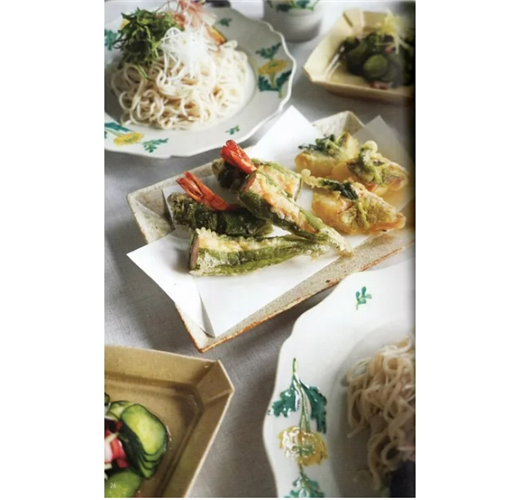 消暑的夏季蕎麥御膳套餐,這裡介紹的二道配菜,分別是在京都萬願寺甜辣椒裡填入蝦肉泥來裹粉油炸、以及在鱸魚塊綁上三葉草來撲粉油炸的天麩羅。