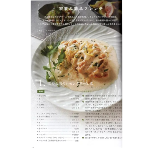 居家的法式下酒菜,這裡提案了清爽軟嫩的檸檬奶油雞、無花果莫札瑞拉起司(前菜)、芹香油泡烏賊、以及蠶豆冷濃湯等使用季節食材的4道食譜。