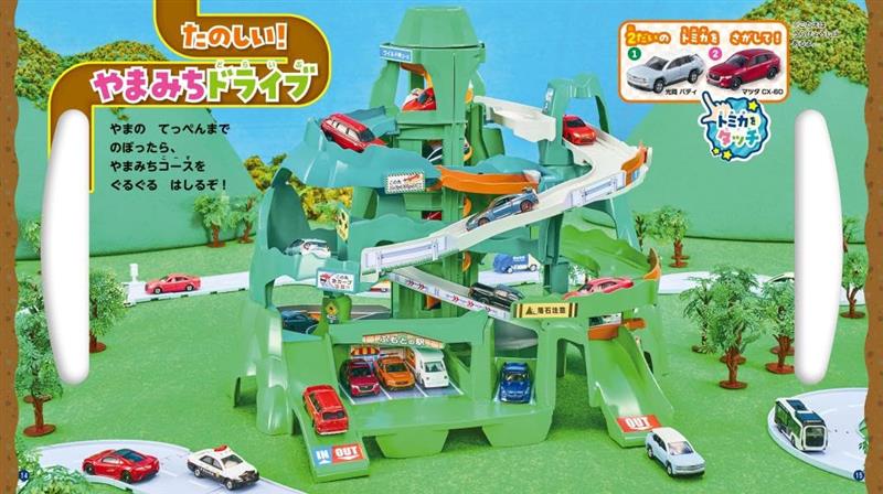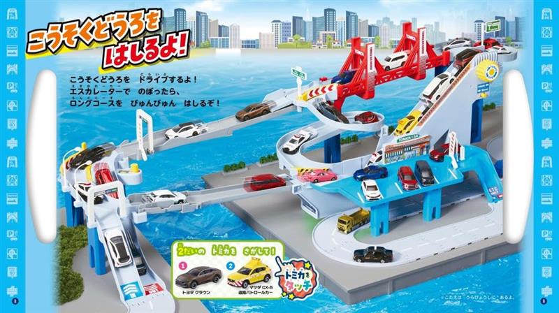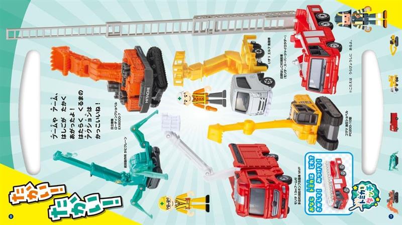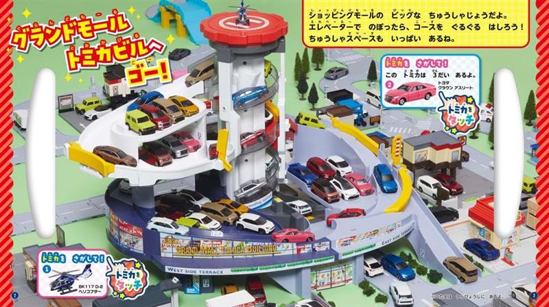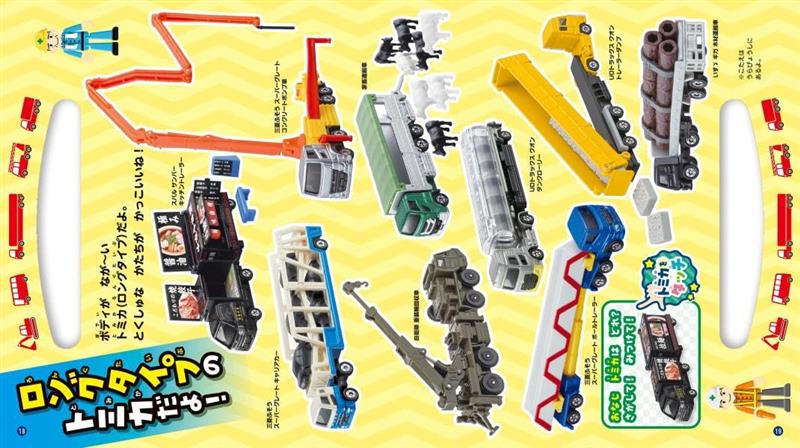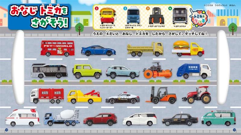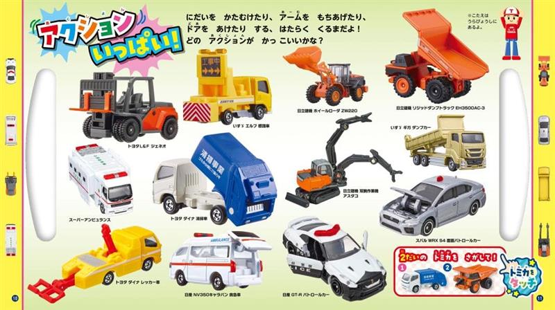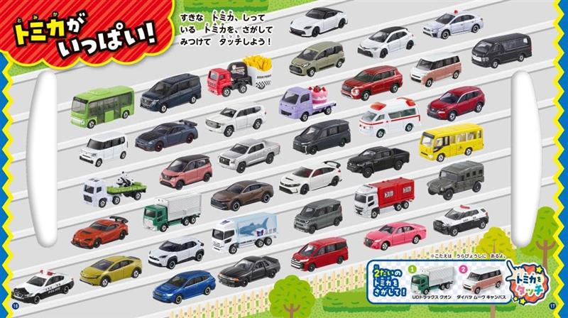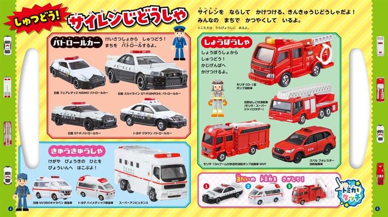 パトロールカーやしょうぼうしゃや働く車からさがす!新しいグランドモール トミカビルや、高速道路や山道などのジオラマ写真からさがす!トラックや乗用車など知ってる車からさがす!かっこいいアクションの車、ロングタイプトミカからさがす!など盛りだくさんの9見開き。お名前を書いて、おでかけに持って行ってね!