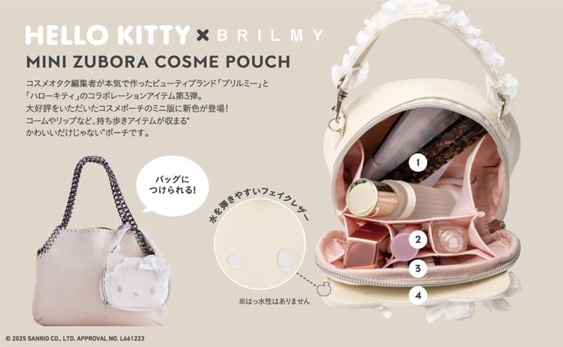 美妝編輯誠摯創立的美妝品牌「BRILMY」與「HELLO KITTY」推出了第三波的聯名合作商品。這回登場的單品是很得許多粉絲朋友歡迎喜愛的迷你版珍珠白化妝包「MINI ZUBORA COSME POUCH PEARL WHITE ver.」,手掌大小的精巧尺寸,卻有著超乎想像的容量,例如梳子、護手霜、喉糖等的隨身必需品,都可以輕鬆收納。