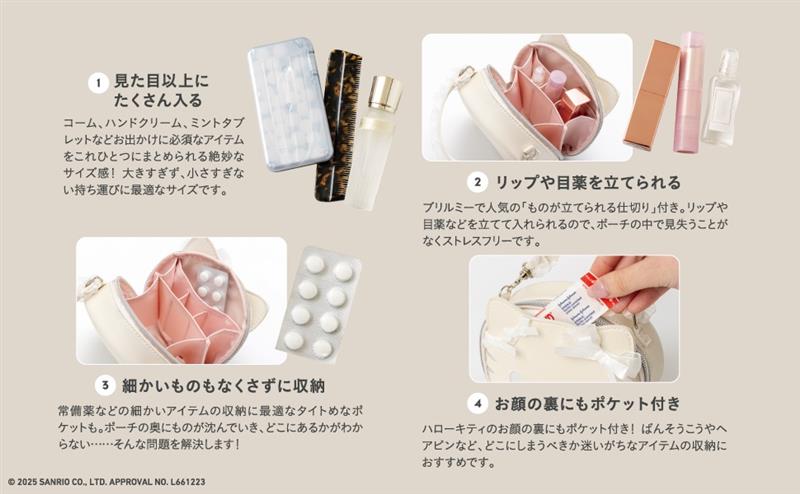 外觀本身是高顏值的HELLO KITTY頭臉造型,連同可愛的緞帶蝴蝶結&包覆著短提把的蕾絲花邊都是清一色的白,只在臉部五官的勾勒和蘋果拉鍊頭選用了銀色來展現低調奢華的印象。提把單邊安裝了釦環,方便將化妝包掛在大包包上來攜帶。化妝包內部選用了柔和的櫻花粉,品牌標籤也低調藏在內側。備有「BRILMY」最受好評的「直式分格」,唇膏、眼藥水等都可以好好歸位、方便取用。緊度適中的口袋,很適合用來收納常備藥品等的小物件,免去在包包裡大海撈針的困擾。在HELLO KITTY的臉部內側,也安排了口袋可以用來收納OK繃(絆創膏)、髮夾等的瑣碎物品。做工精緻、造型可愛的這款迷你化妝包,可以輕鬆為您整理小物、增加容量,並且時尚帶著走。