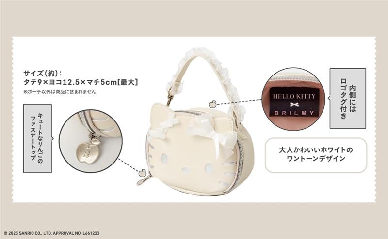 附加商品說明:附外觀採用HELLO KITTY的頭臉造型,連同蝴蝶結與提把蕾絲裝飾,整體採取白色設計。只在五官和蘋果造型拉鍊頭選用了銀色。袋內為柔和的櫻花粉色,品牌標籤也附在內側。備有BRILMY好用的直式分格、緊度適中的口袋,臉部內側也有方便收納零碎小物的口袋。提把附釦具方便掛在大包包上,方便小物整理收納,還能時尚帶著走。(尺寸:約H9×W12.5×D5cm [最大])