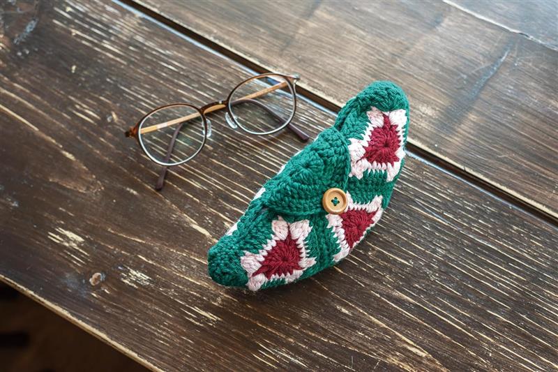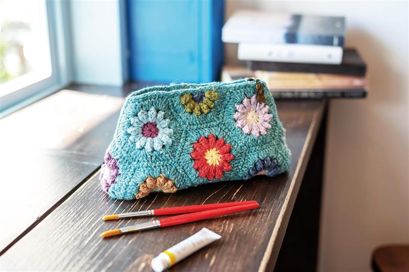 將色彩鮮豔的六角花朵織片連接起來,就是這款獨一無二的拉鍊收納包,寬底設計確保了容量,用途相當廣泛。